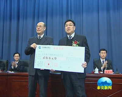 泰安市委書(shū)記李洪峰(左一)為集團(tuán)董事長(zhǎng)陳隊(duì)范(右一)頒獎(jiǎng)